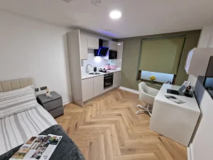 学校まで徒歩15分の場所にあるリバプール中心地のレジデンスです。キッチン、リビングスペース、ジム、ランドリールームなどの共用施設があります。