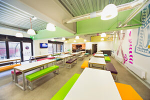 学校は校内に学生寮とカフェテリアを備えた最先端の施設です。モダンでスタイリッシュな内装で、クリエイティブな街を象徴するようなアートワークに囲まれています。